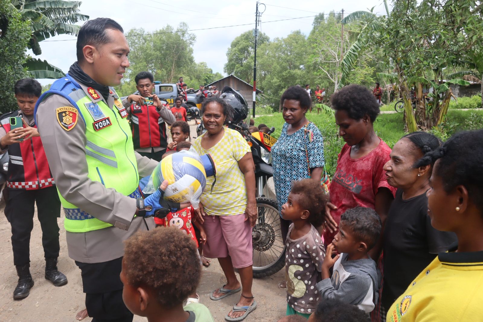 MERAUKE– Kapolres Merauke, AKBP Leonardo Yoga, S.I.K., M.M memberikan sejumlah alat olahraga kepada masyarakat di 6 titik kabupaten Merauke, Senin (27/1). Alat olahraga yang diberikan berupa net volley, bola volley, bola futsal dan bola kaki.