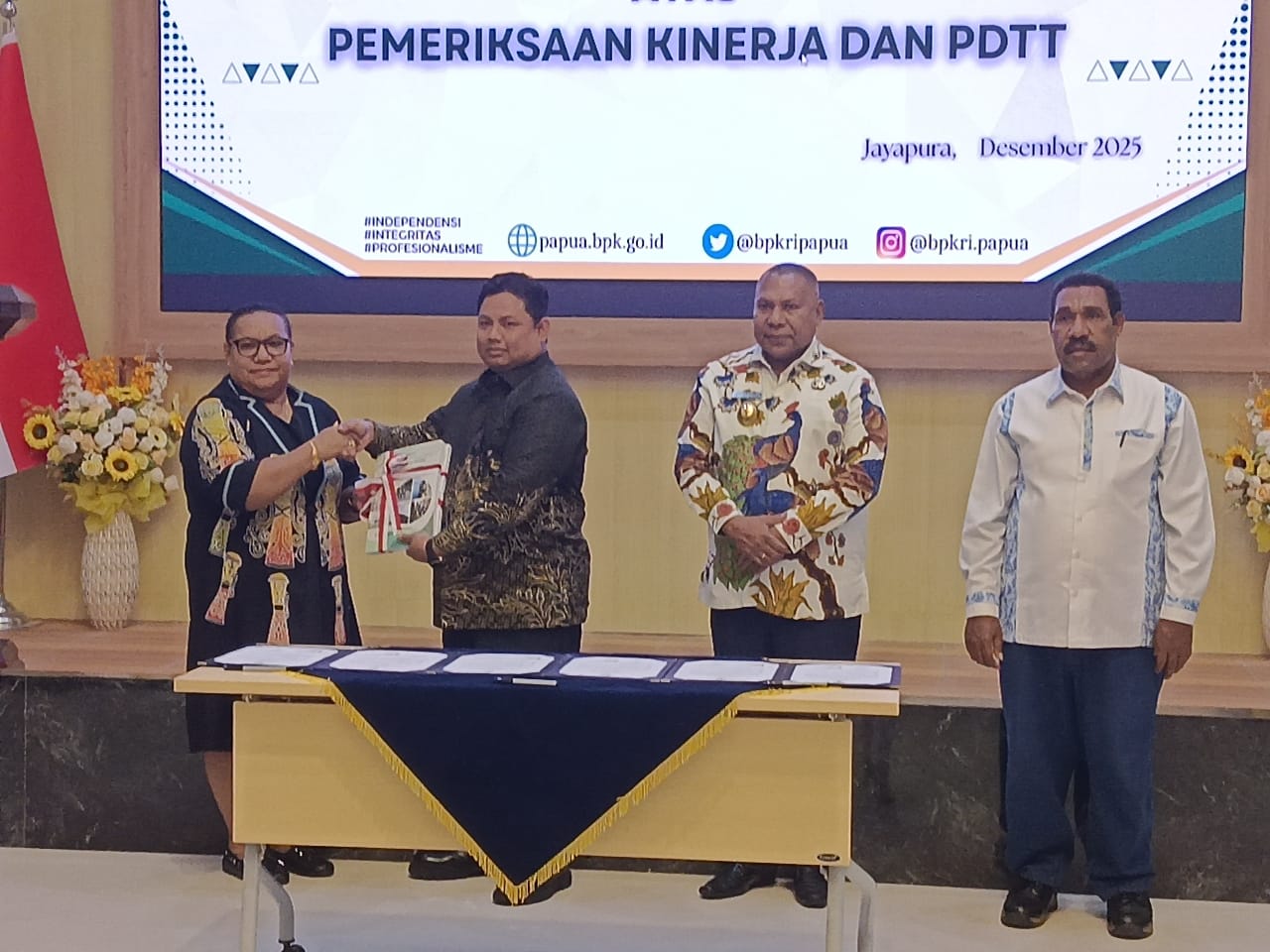 Jayapura,- Wakil Ketua I DPR Papua, Herlin Beatrix M Monim, SE. MM menghadiri acara penyerahan Laporn Hasil Pemeriksaan (LHP) BPK RI atas Pemeriksaan Kinerja dan Pemeriksaan Dengan Tujuan Tertentu (PDTT) di Kantor BPK RI Perwakilan Provinsi Papua, pada Kamis, 15 Januari 2026.