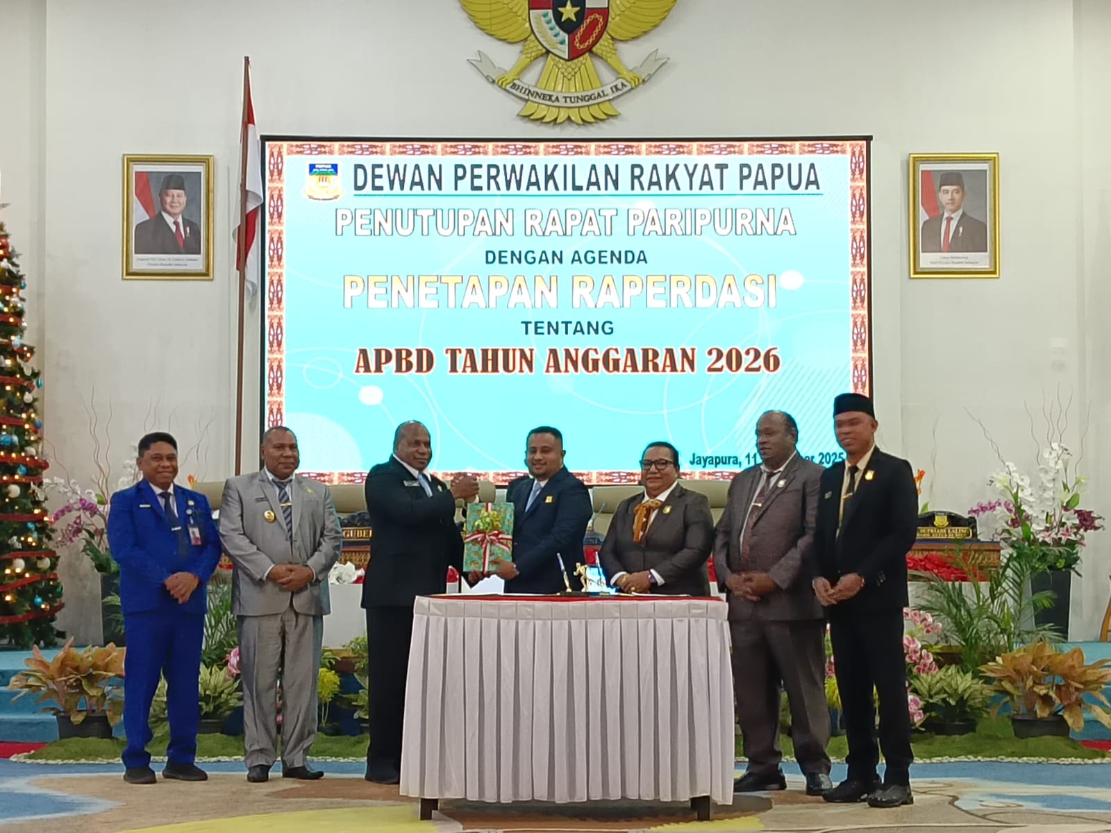 Jayapura,- Rancangan Peraturan Daerah Provinsi tentang Anggaran Pendapatan dan Belanja Daerah (APBD) Papua Tahun Anggaran 2026 resmi disahkan menjadi Peraturan Daerah dalam Rapat Paripurna DPR Papua yang berlangsung di Ruang Sidang DPR Papua, pada Kamis malam, 11 Desember 2025