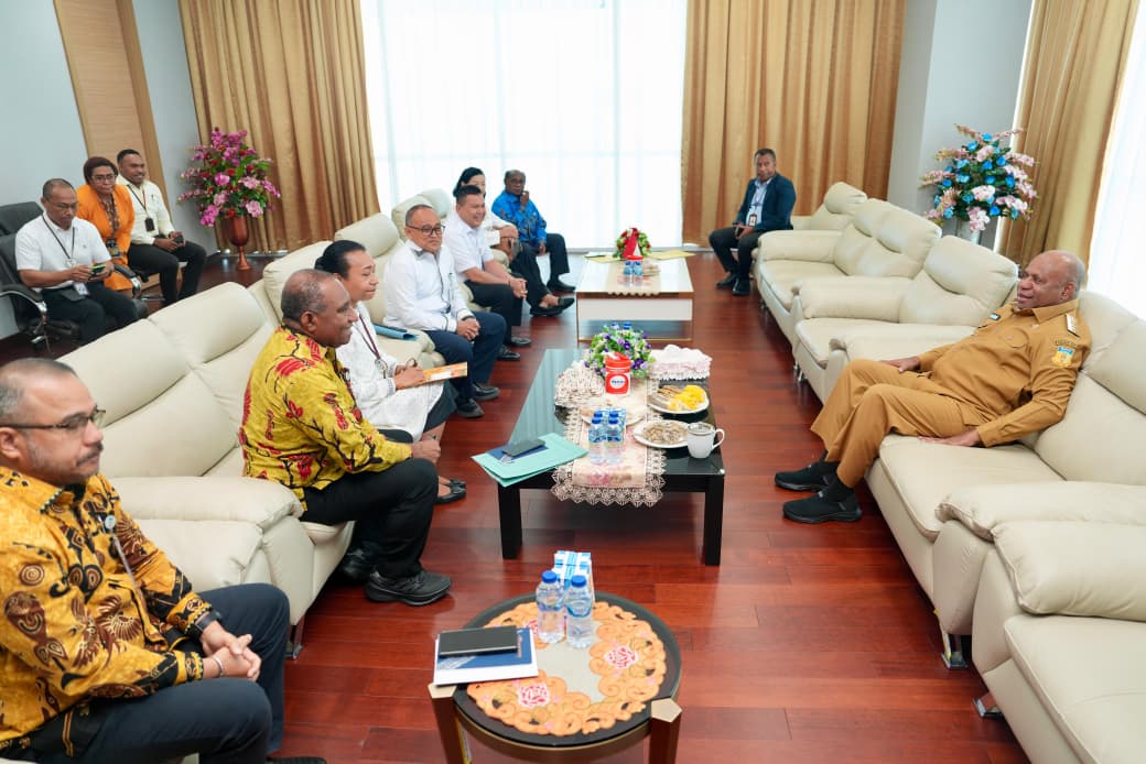JAYAPURA,- Jajaran Direksi dan Dewan Komisaris Bank Papua melakukan kunjungan silaturahmi ke ruang kerja Gubernur Papua, Matius Fakhiri, Senin (3/11) pagi. Kunjungan tersebut bertujuan untuk melaporkan secara langsung kondisi terkini Bank Papua kepada Gubernur selaku Pemegang Saham Pengendali dan Pemegang Saham Mayoritas, sekaligus memperkuat koordinasi dengan pemerintah provinsi.