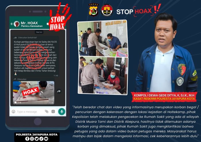 Kasat Reskrim Polresta Jayapura Kota, Kompol I Dewa Gede Ditya mengatakan bahwa kejadian tersebut tidak benar. ”Kami memastikan informasi yang beredar bahwa pasien tersebut korban begal dan sudah meninggal dunia itu tidak benar alias hoaks. Saat ini kami sedang melakukan penyelidikan terkait siapa yang hendak membuat masyarakat menjadi resah dengan menggiring opini tersebut,” ucap Kasat dalam keterangannya, Minggu (5/10/2025).