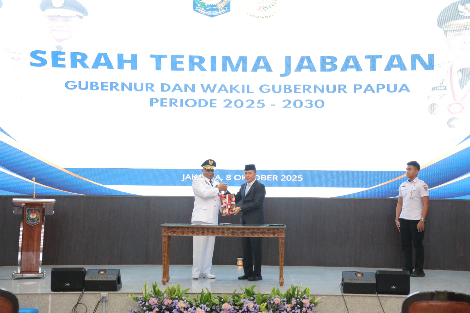JAKARTA,- Pelaksana Tugas (Plt.) Kepala Badan Pengelola Keuangan dan Aset Daerah (BPKAD) Provinsi Papua, Dr. M. Rusdianto Abu, S.AP., M.Si., menghadiri serah terima jabatan (sertijab) dari Penjabat (Pj) Gubernur Papua, Agus Fatoni, kepada Gubernur dan Wakil Gubernur Papua terpilih, Matius D. Fakhiri dan Aryoko Rumaropen, di Gedung C Lantai III Kementerian Dalam Negeri (Kemendagri), Jakarta, Rabu, 08 Oktober 2025, petang.
