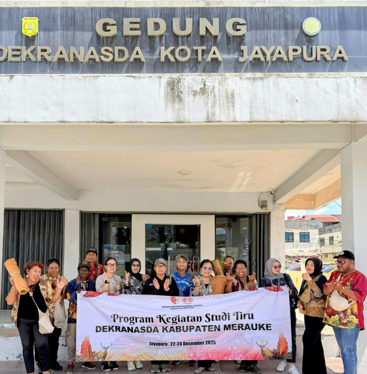 MERAUKE-Ketua Dekranasda Kabupaten Merauke, Nova Gebze beserta jajaran fokus mendorong peningkatan kapasitas anggota UMKM terutama para pengrajin seperti pengrajin Batik Papua, kriya dan lain sebagainya. Salah satunya dengan melakukan Studi Tiru di Jayapura Provinsi Papua pada tanggal 22 -24 Desember 2025 lalu.