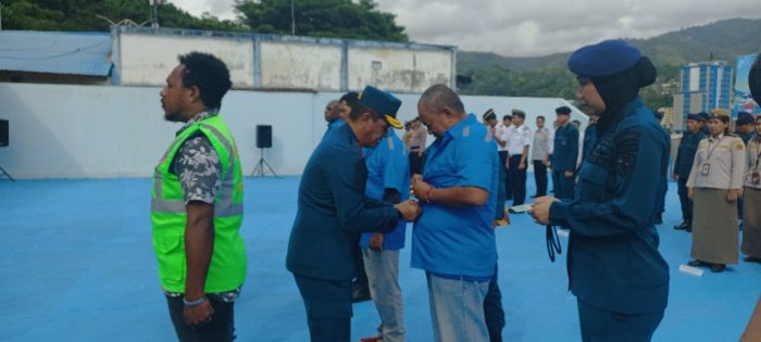 Kepala KSOP Kelas II Jayapura, Abdul Nasir, secara simbolis memakaikan seragam dan kartu identitas kepada perwakilan porter dalam apel tersebut, sebagai tanda dimulainya penggunaan atribut resmi bagi porter yang akan bertugas.