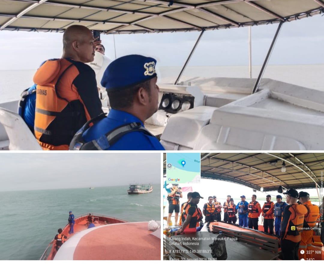 MERAUKE- Polres Merauke melalui Satuan Polairud bersama Basarnas dan instansi terkait ikut melakukan pencarian terhadap 6 orang ABK KM. Bintang Laut yang masih hilang di perairan Merauke. Kamis (22/1), tim gabungan melakukan pencarian menggunakan kapal KN.SAR MERAUKE 223.