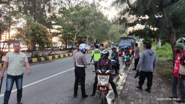 Jayapura – Untuk menciptakan keamanan, keselamatan, ketertiban, dan kelancaran lalu lintas (Kamseltibcarlantas), Satuan Lalu Lintas Polresta Jayapura Kota melaksanakan kegiatan pengamanan dan patroli antisipasi balap liar pada Jumat, 20 Februari 2026.