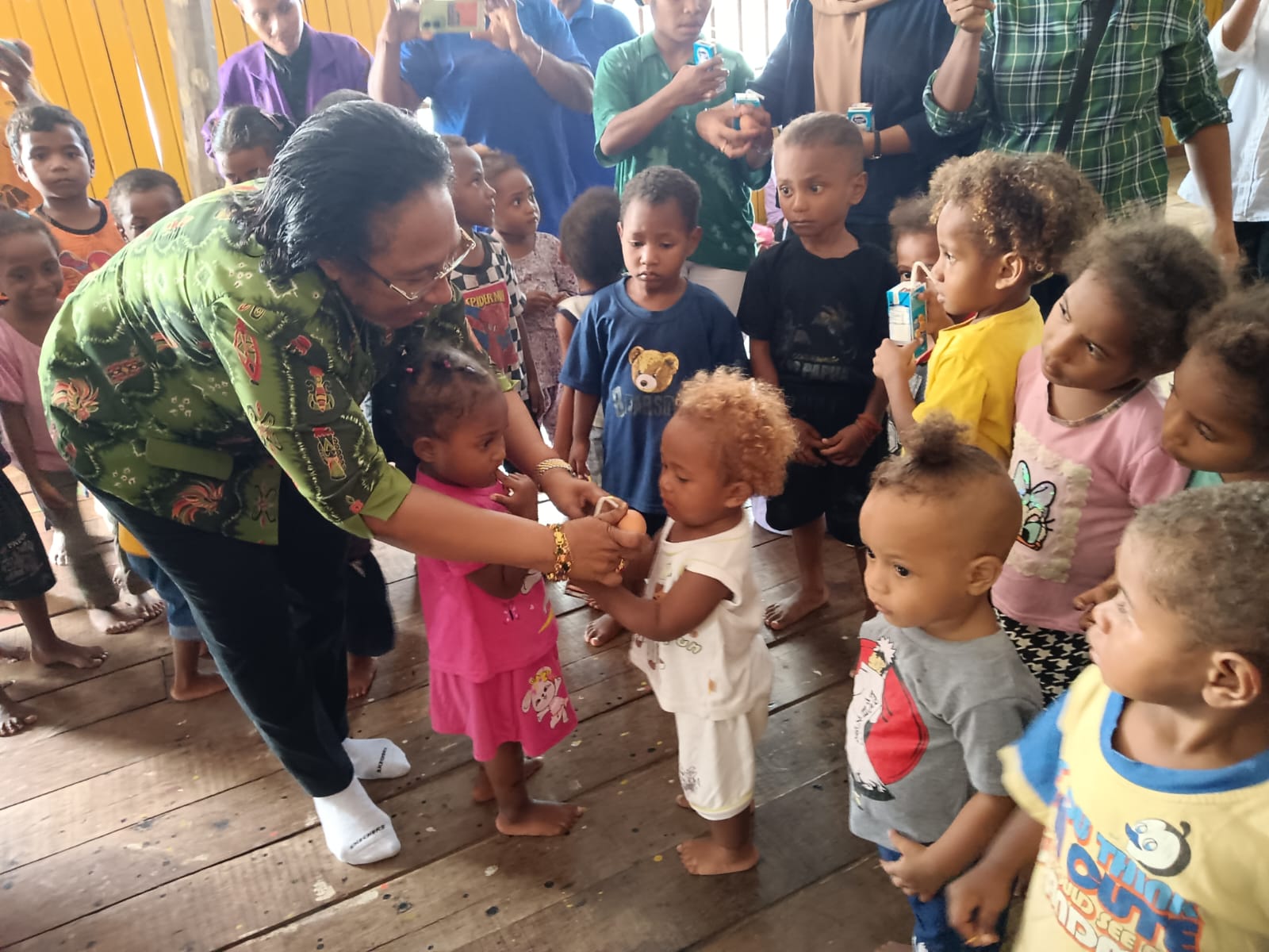 Komandan Lanud Silas Papare Marsma TNI Indan Gilang Buldansyah, S. Sos., bersama Ketua PIA Ardhya Garini Cab. 3/D. III Lanud SPR Ny. Laely Indan Gilang Buldansyah saat berdialog dengan anak – anak panti asuhan Harapan Kita.