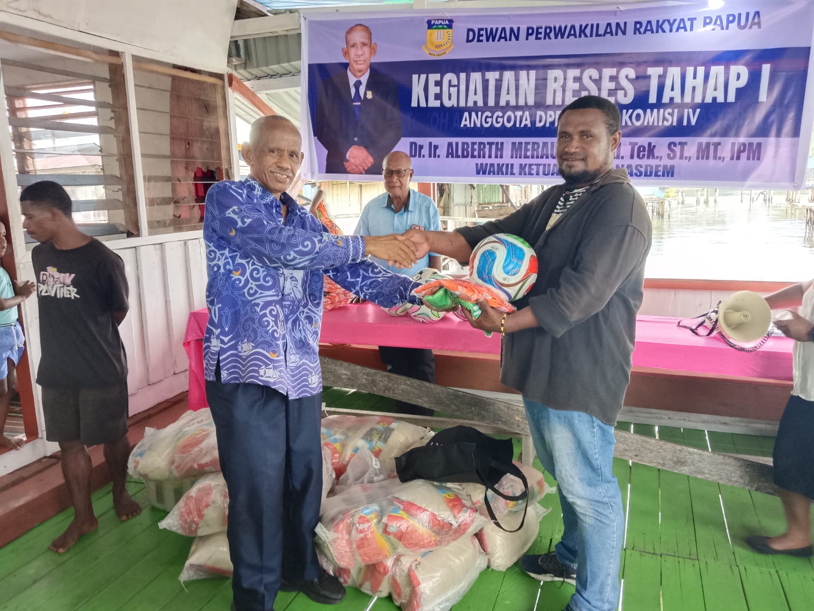 Dalam kegiatan reses tersebut, Alberth Merauje menyalurkan satu paket bantuan olahraga sepak bola kepada generasi muda yang ada di kampung itu. Selain itu, ia juga memberikan bantuan sembako berupa beras kepada warga setempat.