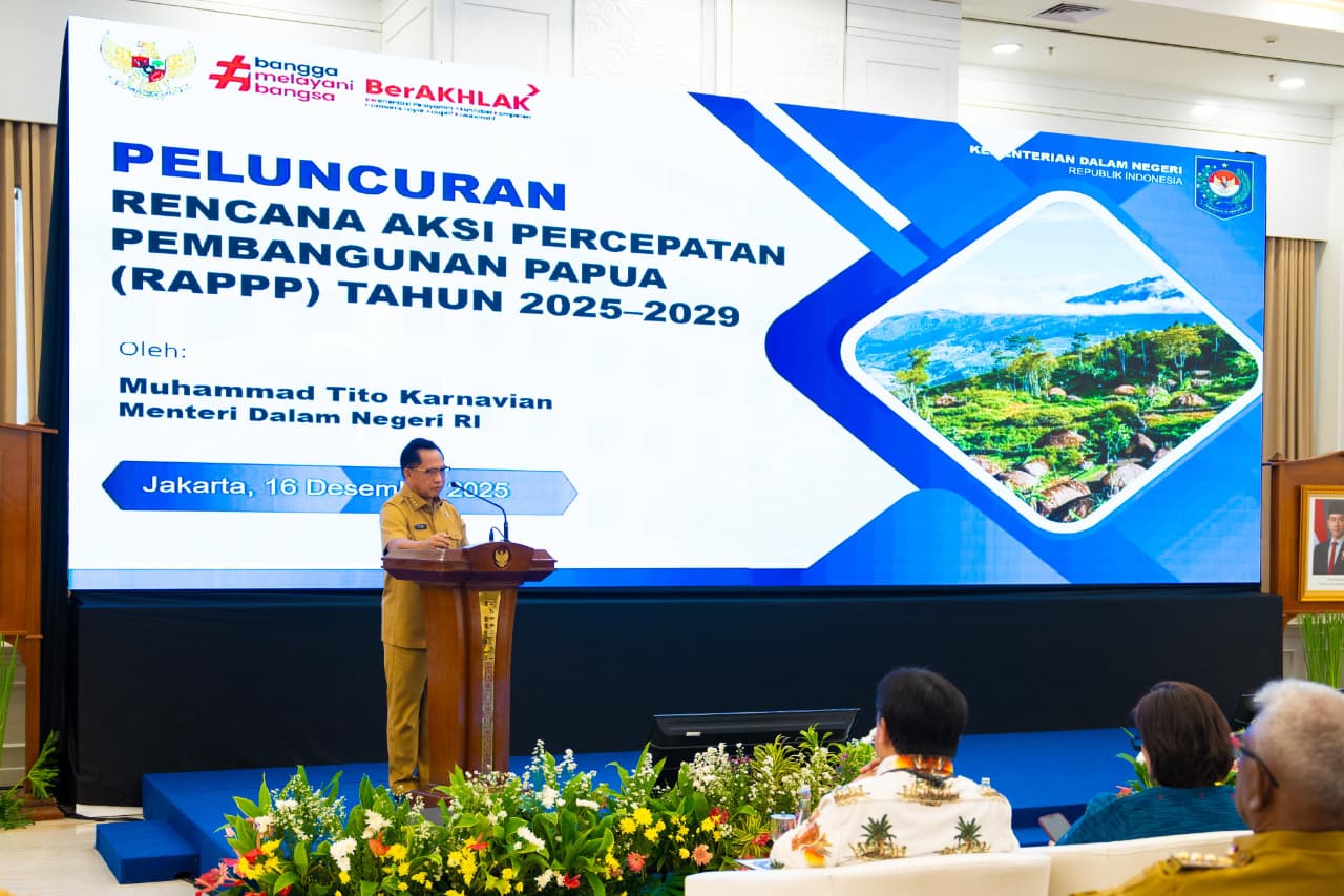 Jakarta,– Menteri Dalam Negeri (Mendagri) Muhammad Tito Karnavian mengimbau agar Rencana Aksi Percepatan Pembangunan Papua (RAPPP) Tahun 2025–2029 menjadi rujukan kepala daerah di wilayah Papua dalam menyusun Rencana Kerja Pemerintah Daerah (RKPD). Terlebih, grand design ini juga membuka ruang masukan dari kepala daerah terkait langkah percepatan pembangunan Papua.