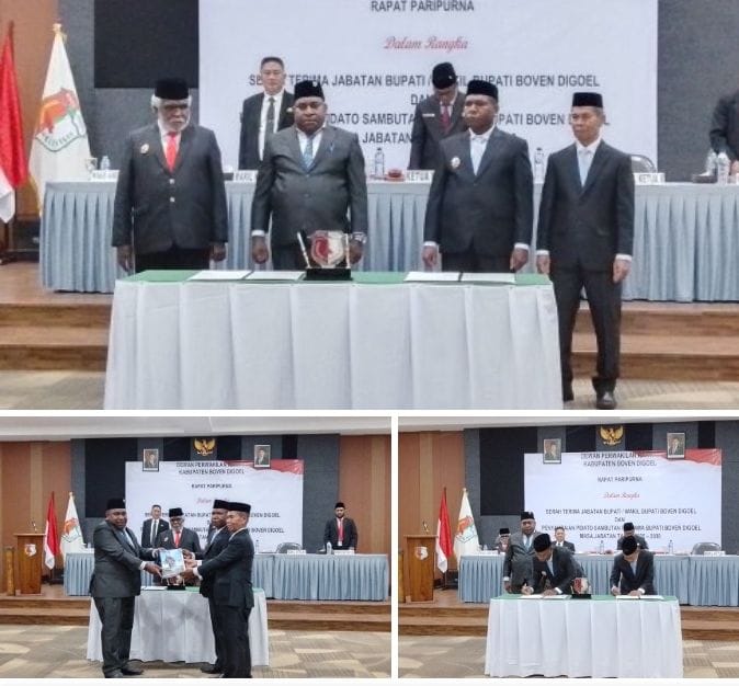 MERAUKE-Ucapan tulus disampaikan oleh Bupati Boven Digoel, Roni Omba setelah dirinya dan sang wakil, Marlinus resmi dilantik sebagai pimpinan daerah di Kabupaten Boven Digoel serta melakukan sertijab dengan mantan Bupati Boven Digoel, Hengky Yaluwo dan wakilnya, Lexi Romel Wagiu di Hotel Panda, Sabtu (18/10). Sertijab dilakukan dalam sebuah rapat paripurna DPR Kabupaten Boven Digoel dilanjutkan dengan pidato perdana Bupati Roni Omba.